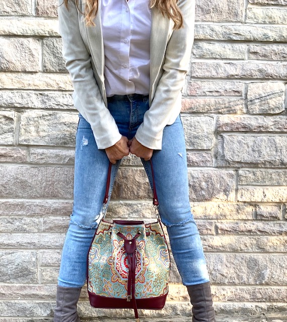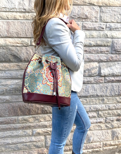 This convertible bucket bag is one of our most popular handbags. Comes with a shoulder strap as well as a long adjustable strap which allows you to use it as a crossbody, adjustable longer shoulder bag, or a backpack. Spacious enough to hold all your essentials. One side has a zipper pocket while the other side has 2 pockets for your phone and any other item which you can access easily.
