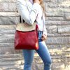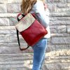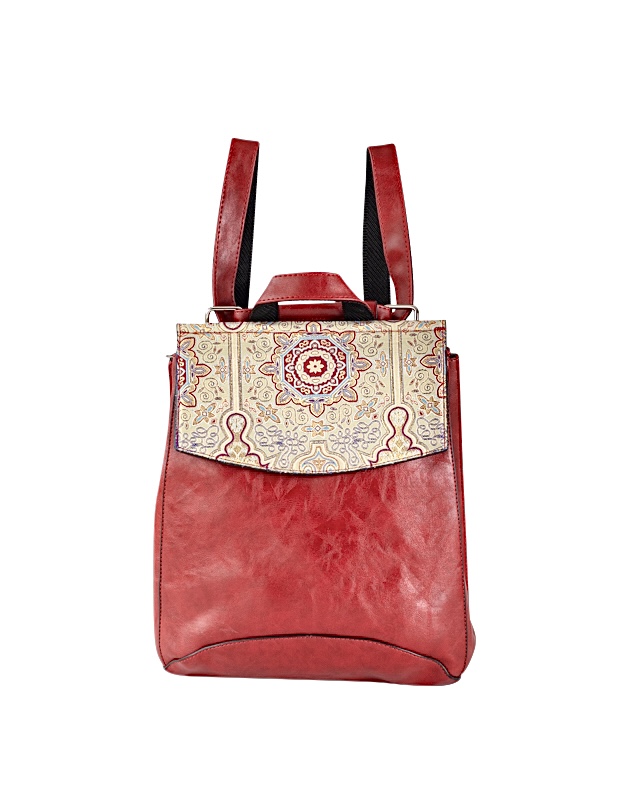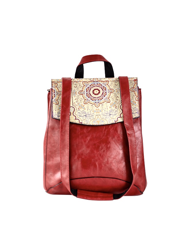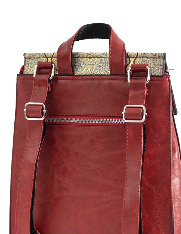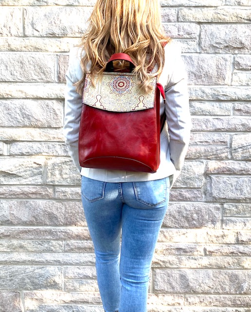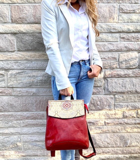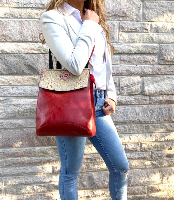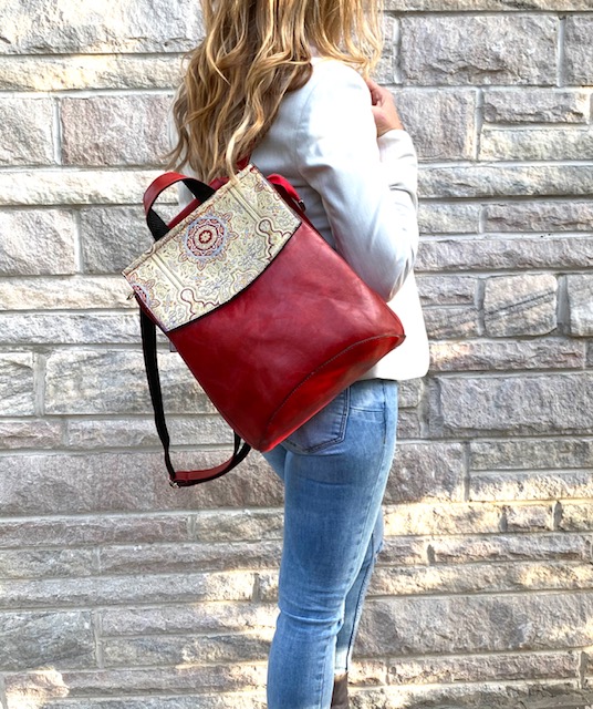 Not just your ordinary backpack! Travel in style with our fashionable handmade one of kind backpacks. Made with a shimmering woven silk kilim design fabric and eye-catching red vegan leather. Easily converts from a backpack to a shoulder bag or crossbody. Spacious enough to hold up to a 13″ laptop. Exterior zipper pocket in the back and expandable sides. Top handle for easy handling. Interior handy zipper pocket perfect for smartphone, wallet, and valuables. Zipper closure and kilim design flap to keep all your valuable safe.