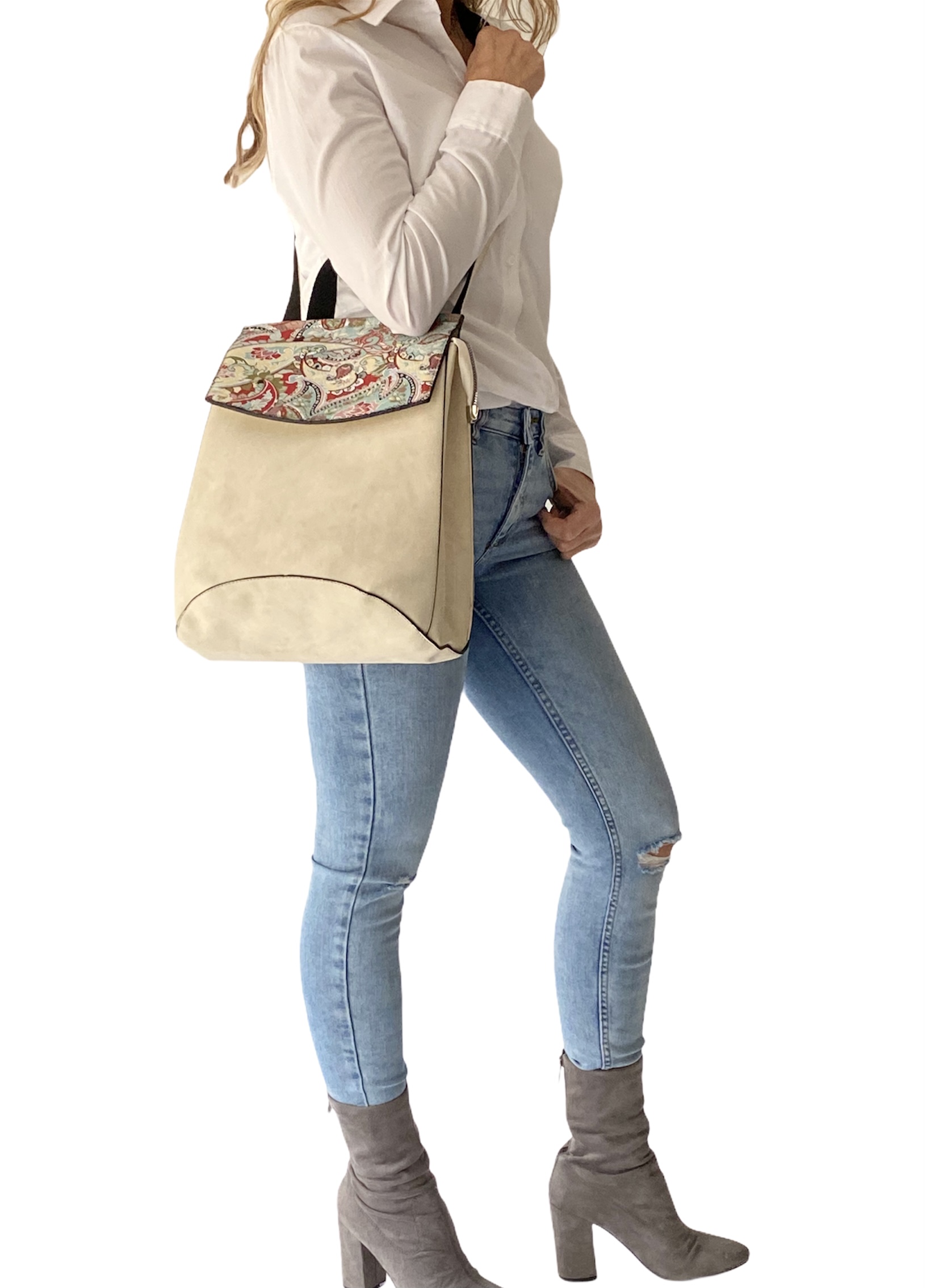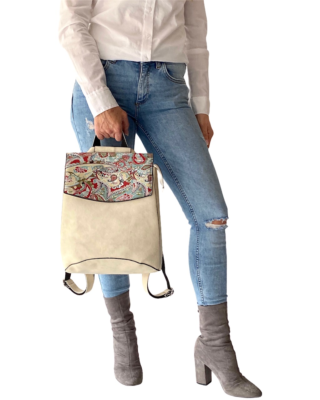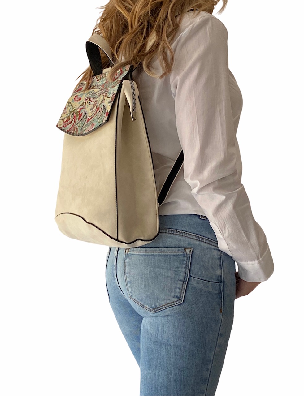 Not just your ordinary backpack! Travel in style with our fashionable handmade one of kind backpacks. Made with a shimmering woven silk kilim design fabric and soft beige suede vegan leather. Easily converts from a backpack to a shoulder bag or crossbody. Spacious enough to hold up to a 13″ laptop. Exterior zipper pocket in the back and expandable sides. Top handle for easy handling. Interior handy zipper pocket perfect for smartphone, wallet, and valuables. Zipper closure and kilim design flap to keep all your valuable safe.