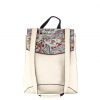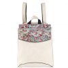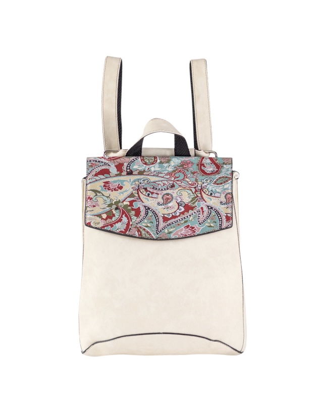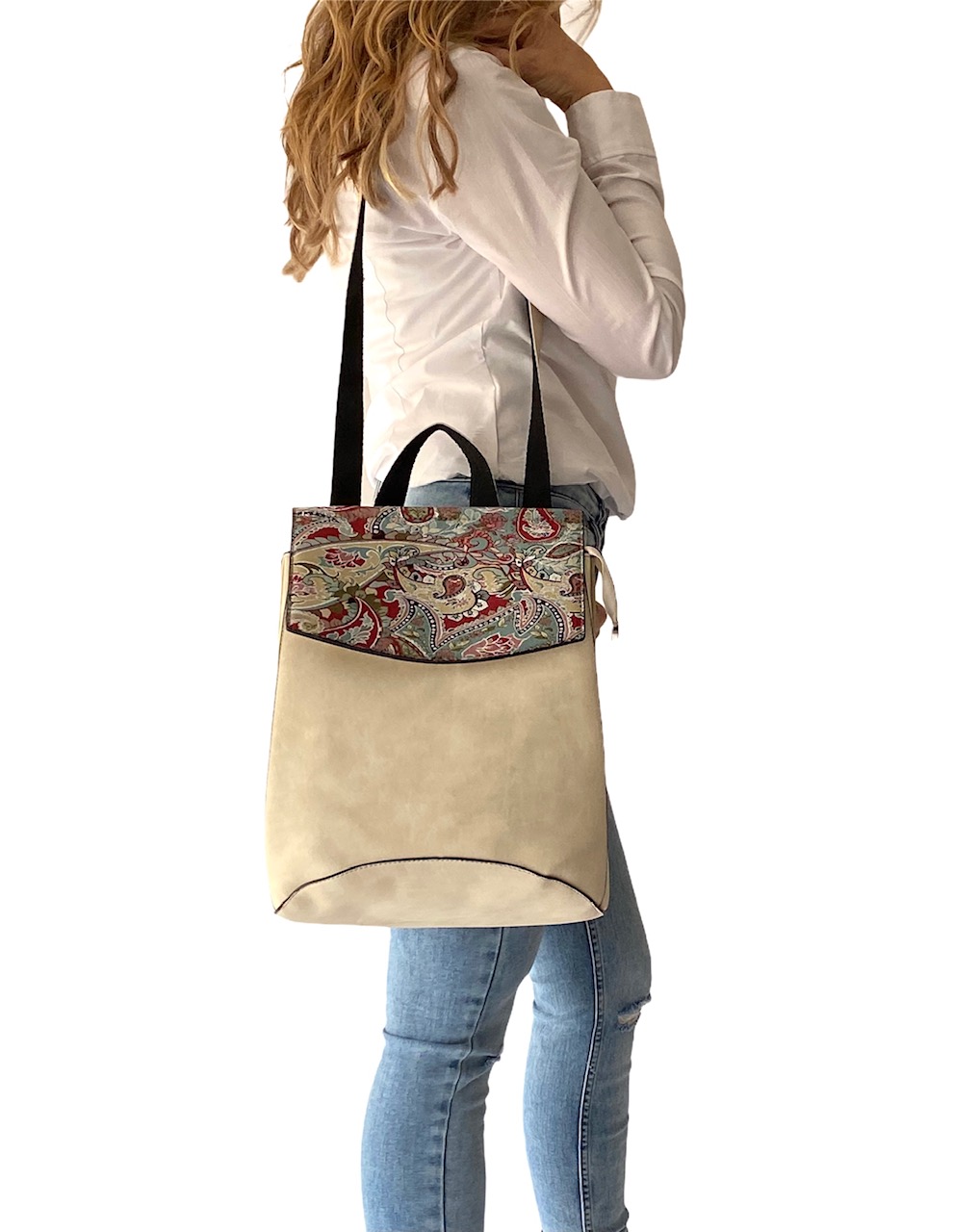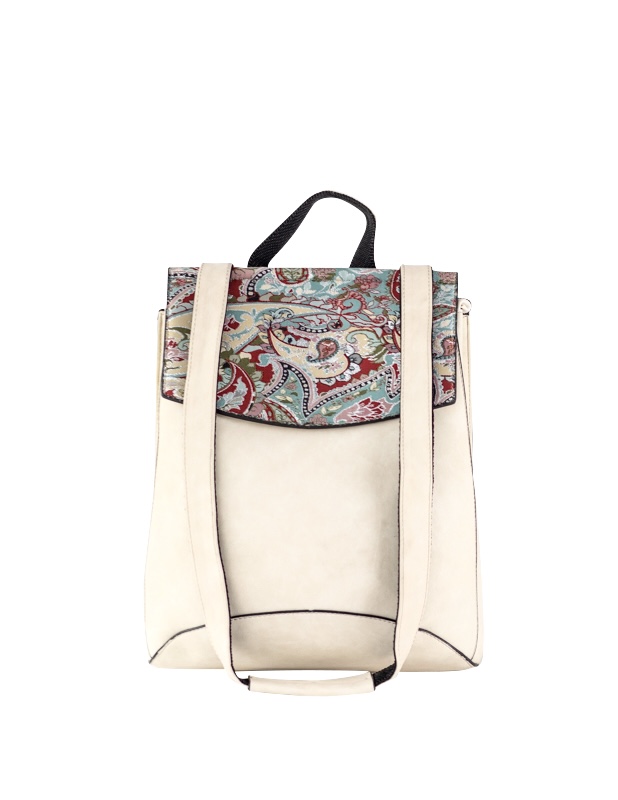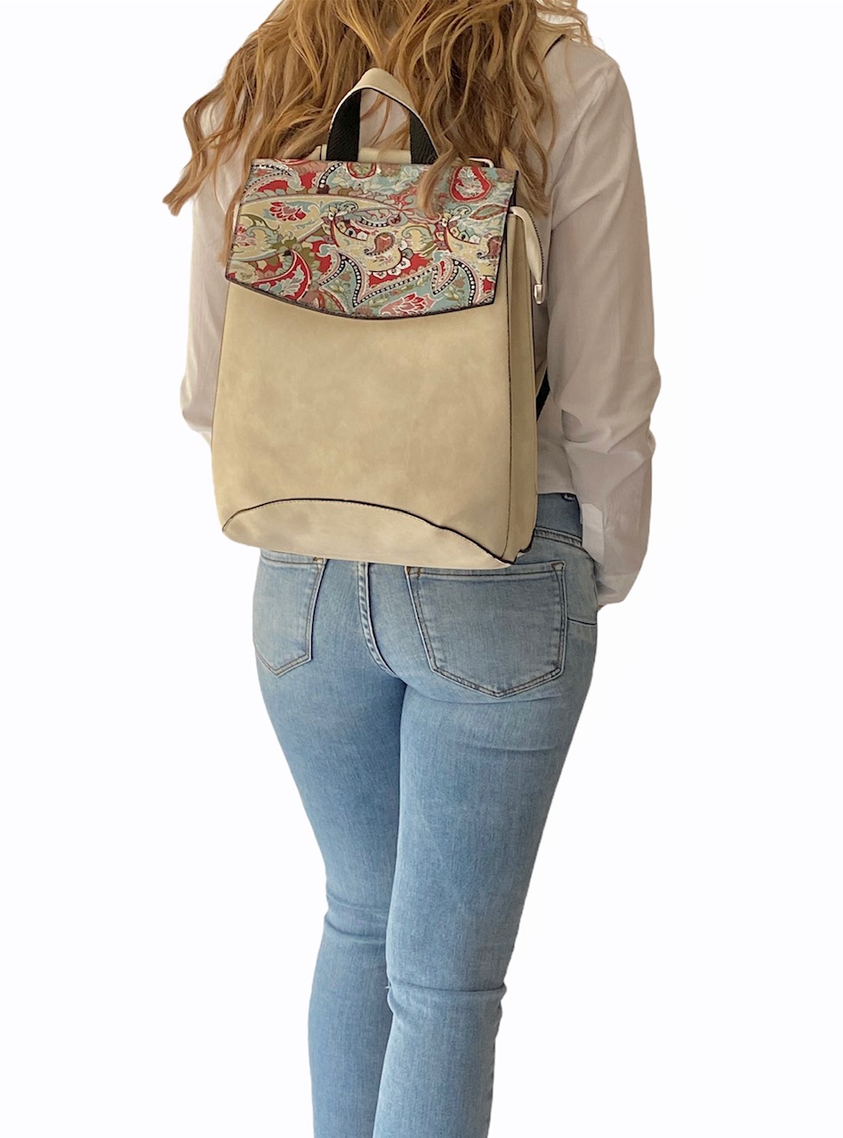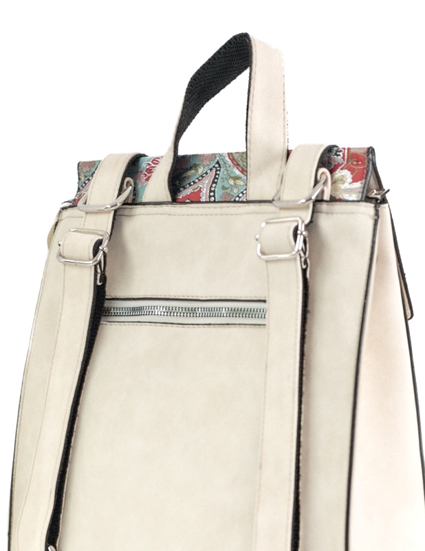 Not just your ordinary backpack! Travel in style with our fashionable handmade one of kind backpacks. Made with a shimmering woven silk kilim design fabric and soft beige suede vegan leather. Easily converts from a backpack to a shoulder bag or crossbody. Spacious enough to hold up to a 13″ laptop. Exterior zipper pocket in the back and expandable sides. Top handle for easy handling. Interior handy zipper pocket perfect for smartphone, wallet, and valuables. Zipper closure and kilim design flap to keep all your valuable safe.