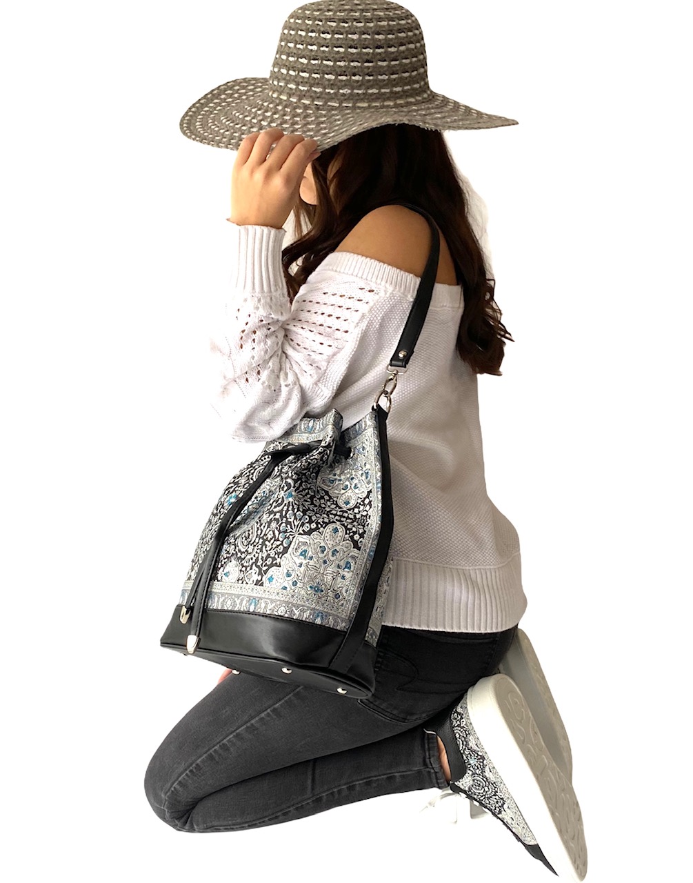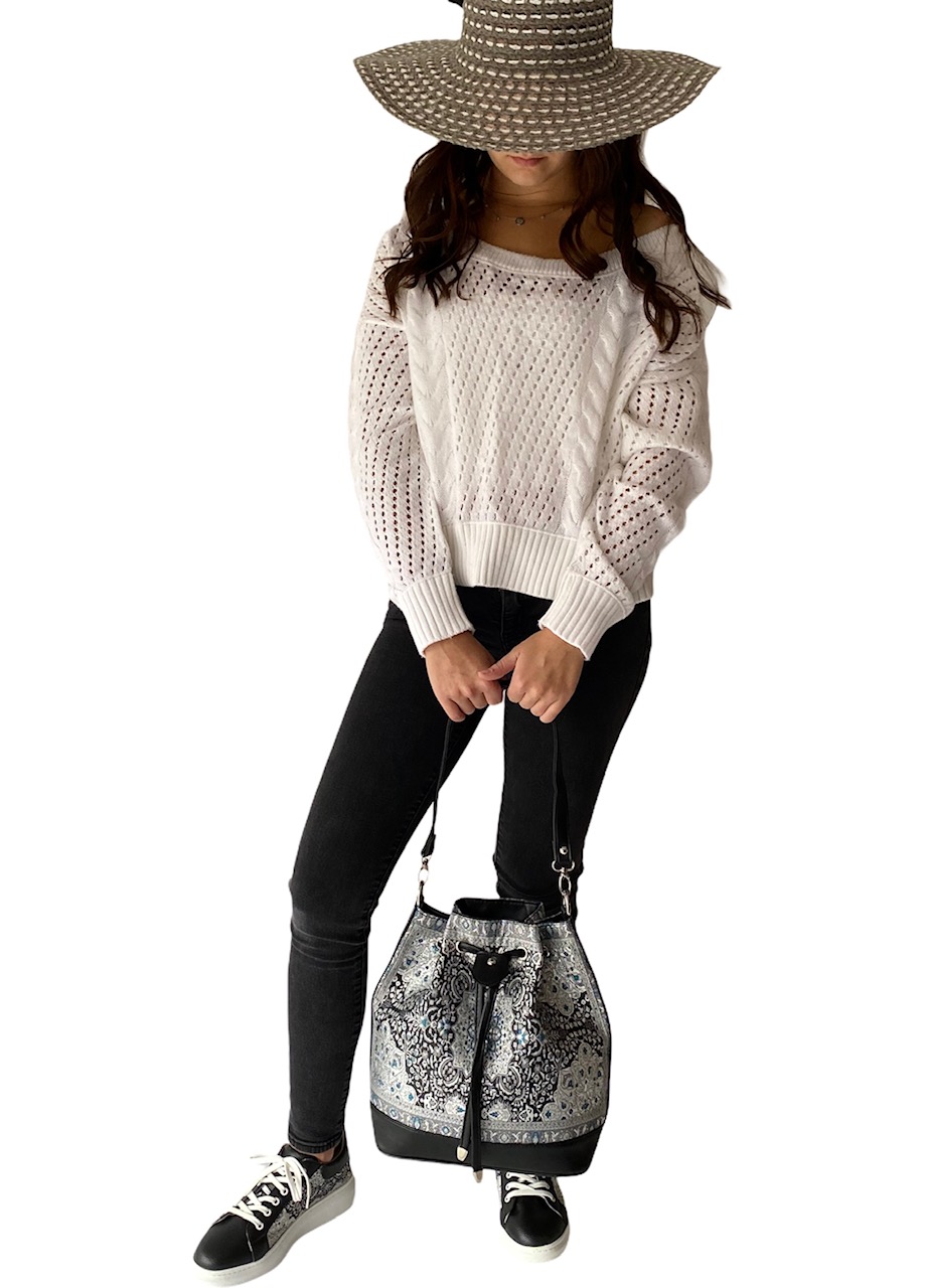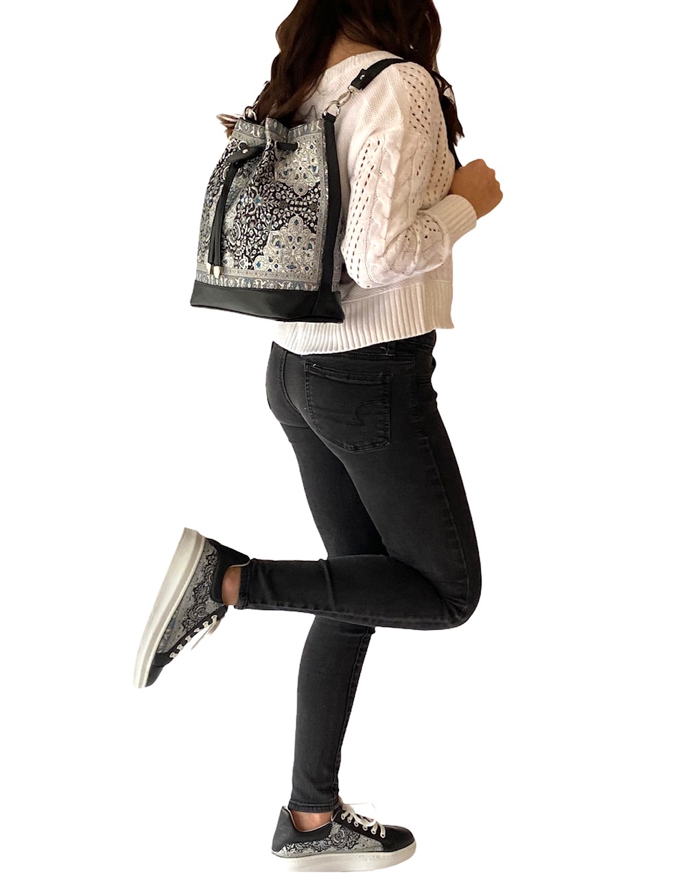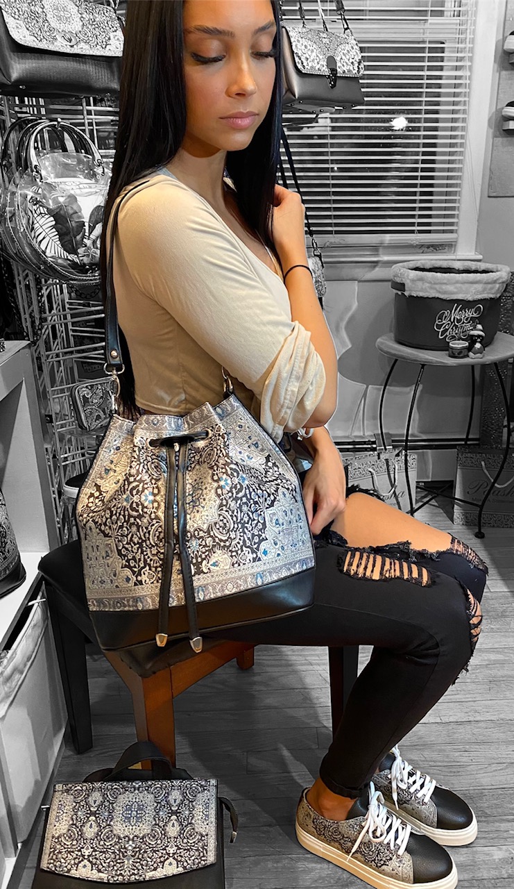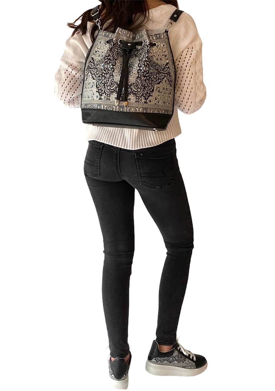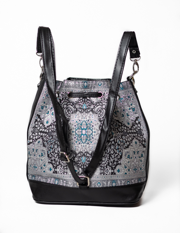 This versatile bucket bag is one of our most popular handbags. Comes with a shoulder strap as well as a long adjustable strap which allows you to use it as a crossbody, longer shoulder bag and even a backpack. Spacious enough to hold all your essentials. One side has a zipper pocket while the other side has 2 pockets for your phone and any other item which you can access easily.