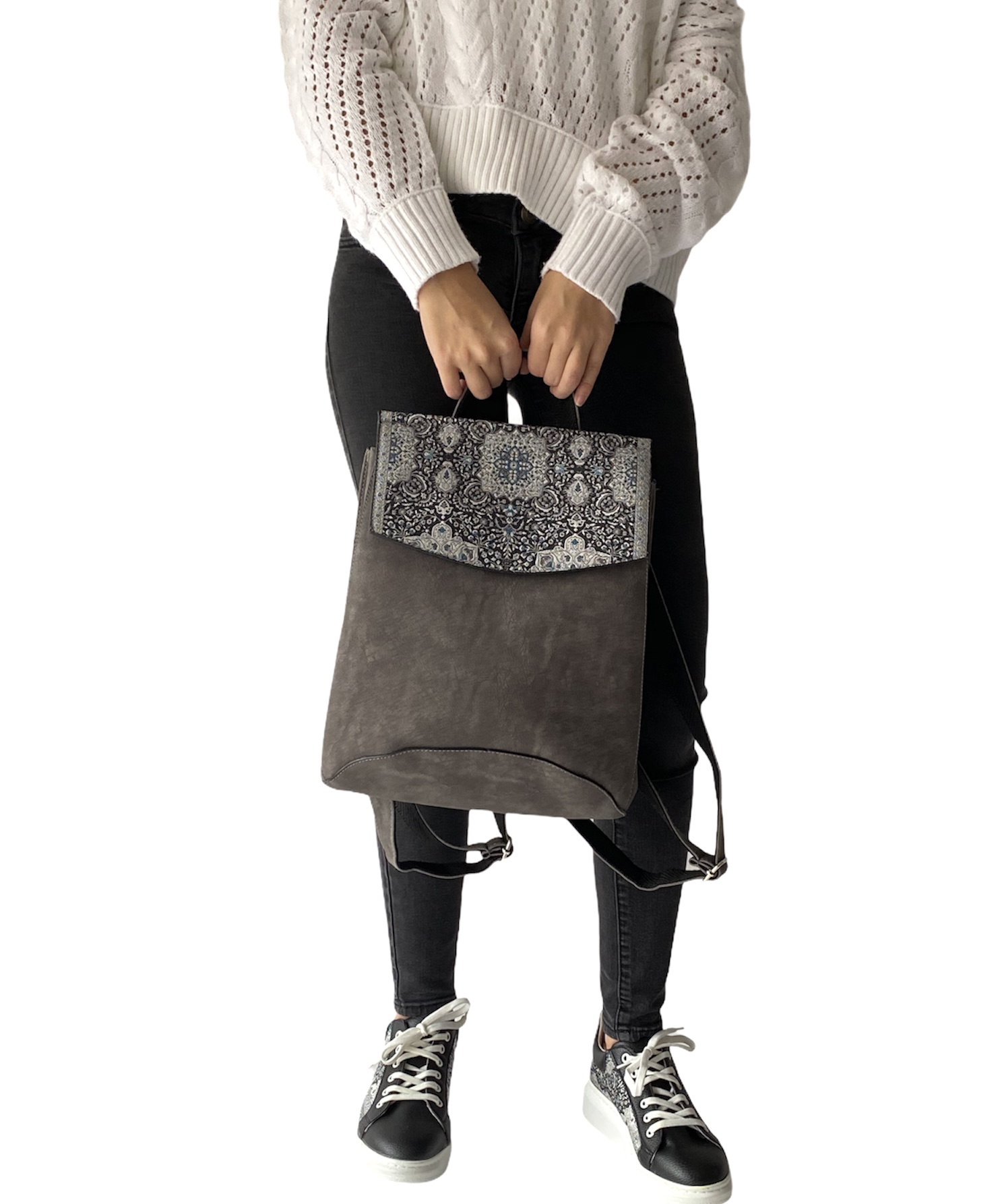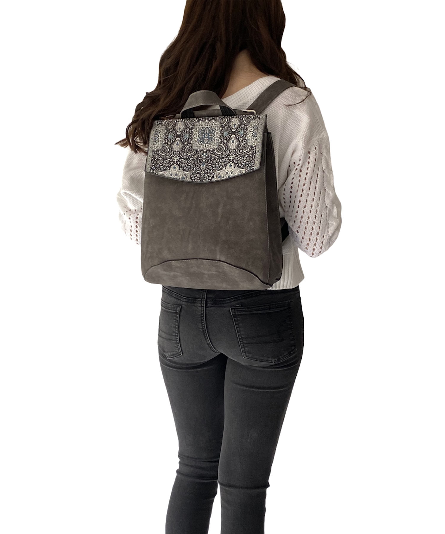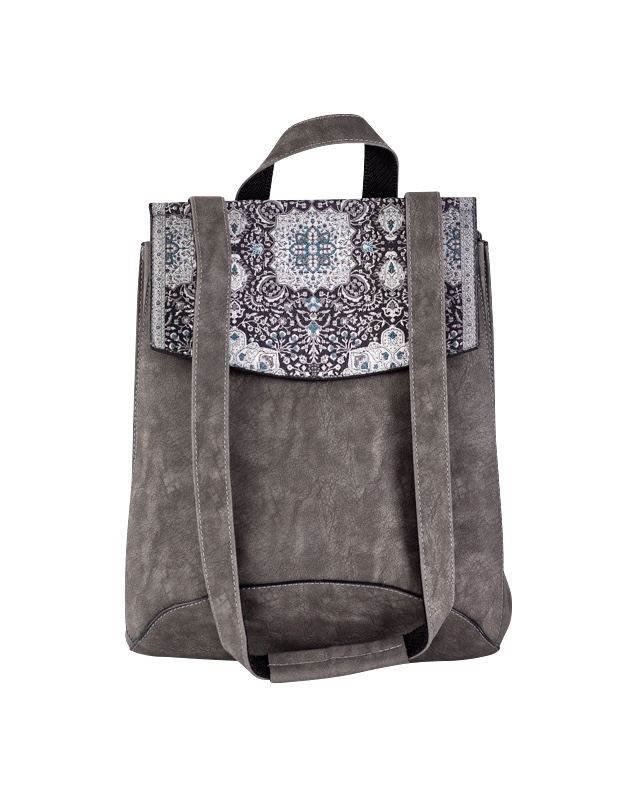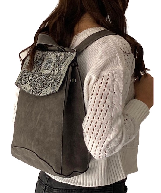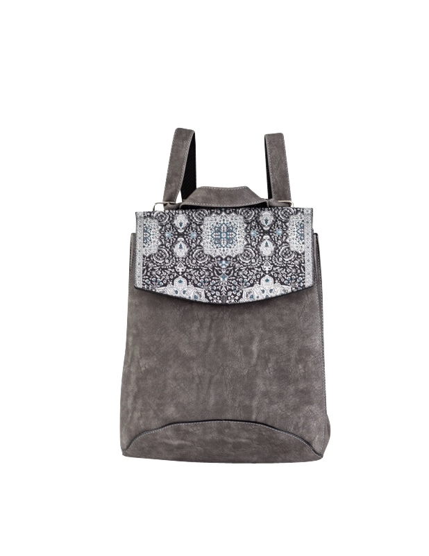 Not just your ordinary backpack! Travel in style with our fashionable handmade one of kind backpacks. Made with a shimmering woven silk kilim design fabric and soft gray suede vegan leather. Easily converts from a backpack to a shoulder bag or crossbody. Spacious enough to hold up to a 13″ laptop. Exterior zipper pocket in the back and expandable sides. Top handle for easy handling. Interior handy zipper pocket perfect for smartphone, wallet, and valuables. Zipper closure and kilim design flap to keep all your valuable safe.