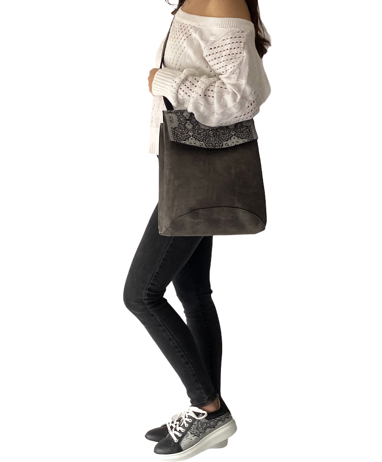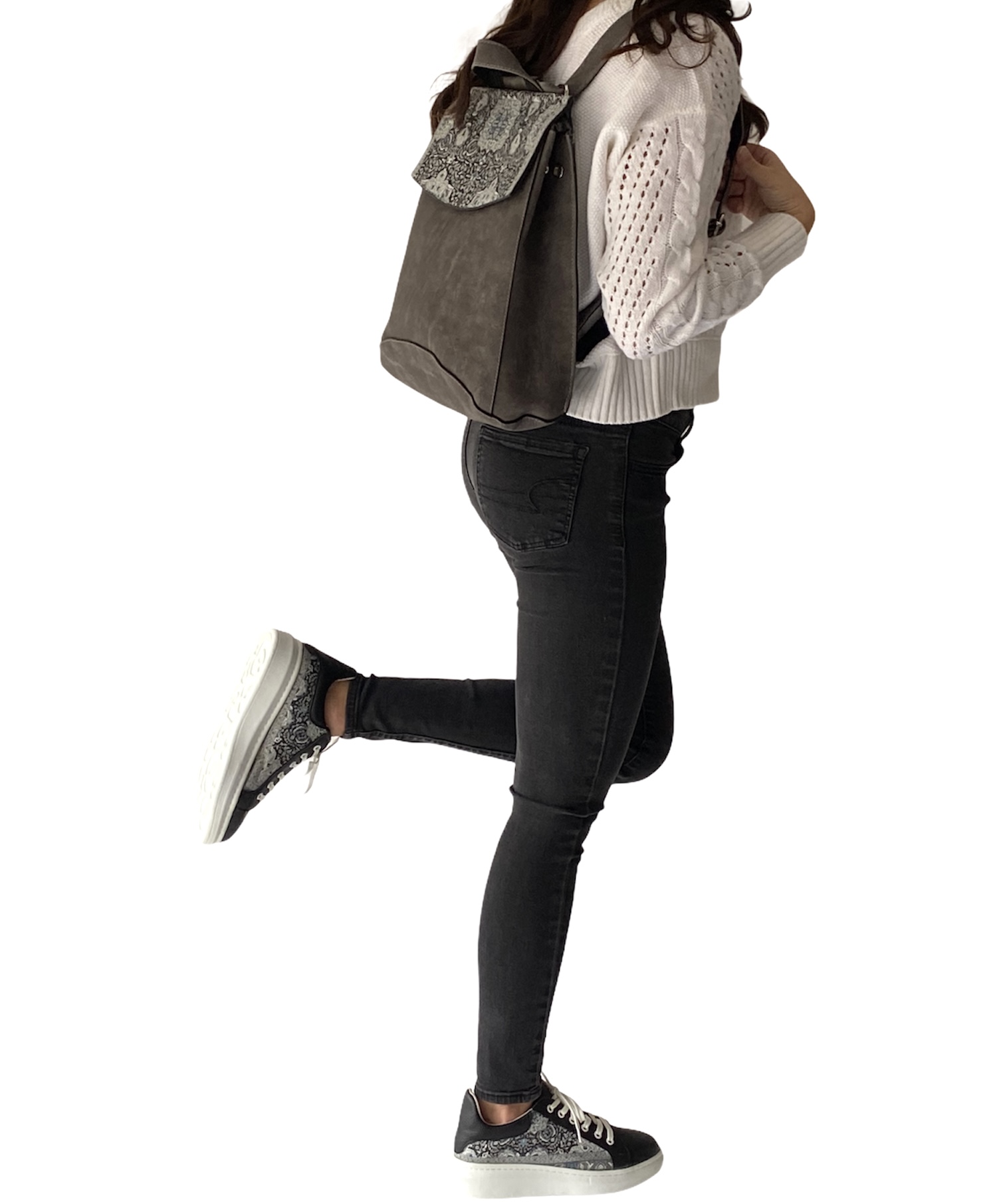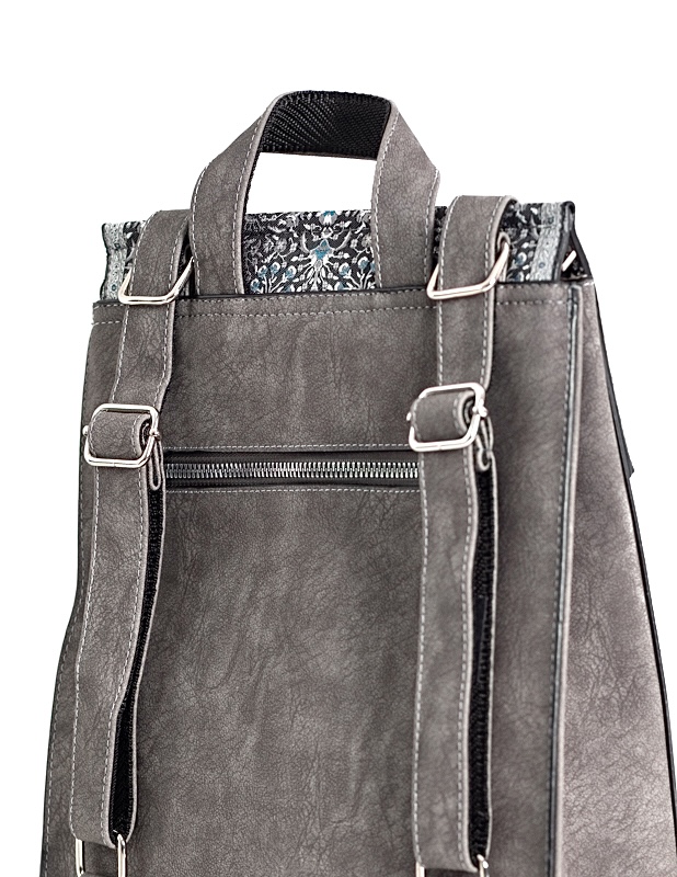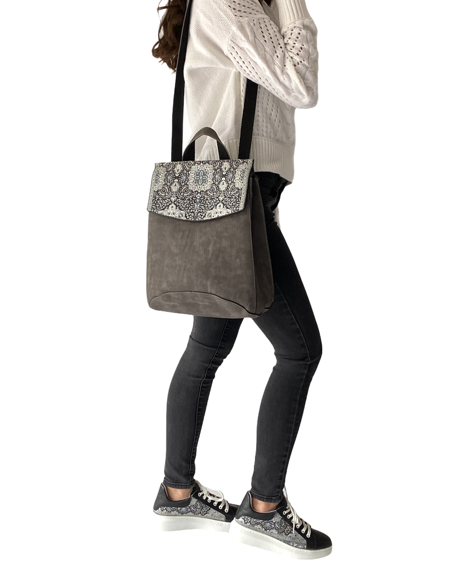 Not just your ordinary backpack! Travel in style with our fashionable handmade one of kind backpacks. Made with a shimmering woven silk kilim design fabric and soft gray suede vegan leather. Easily converts from a backpack to a shoulder bag or crossbody. Spacious enough to hold up to a 13″ laptop. Exterior zipper pocket in the back and expandable sides. Top handle for easy handling. Interior handy zipper pocket perfect for smartphone, wallet, and valuables. Zipper closure and kilim design flap to keep all your valuable safe.
