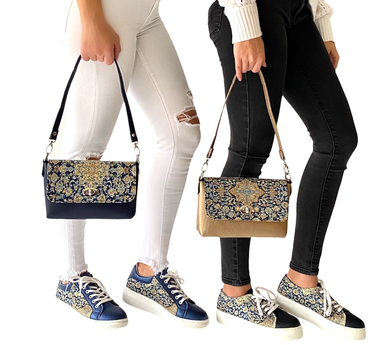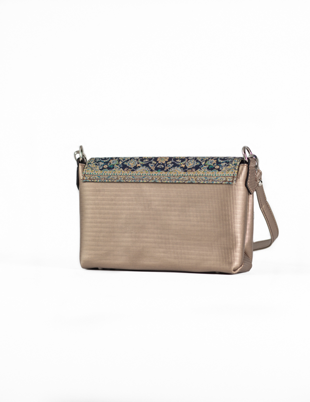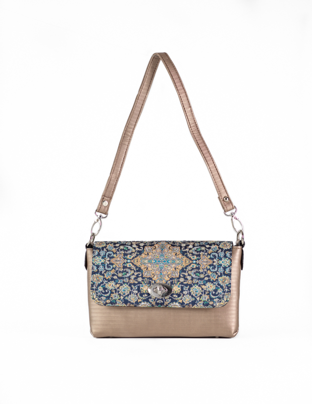Make a statement with this one of a kind handmade vegan baguette. Made using a shimmering kilim design woven silk fabric and stunning textured gold vegan leather. Comes with a removable short shoulder strap as well as a long adjustable crossbody strap. Perfect for shopping or a night out.