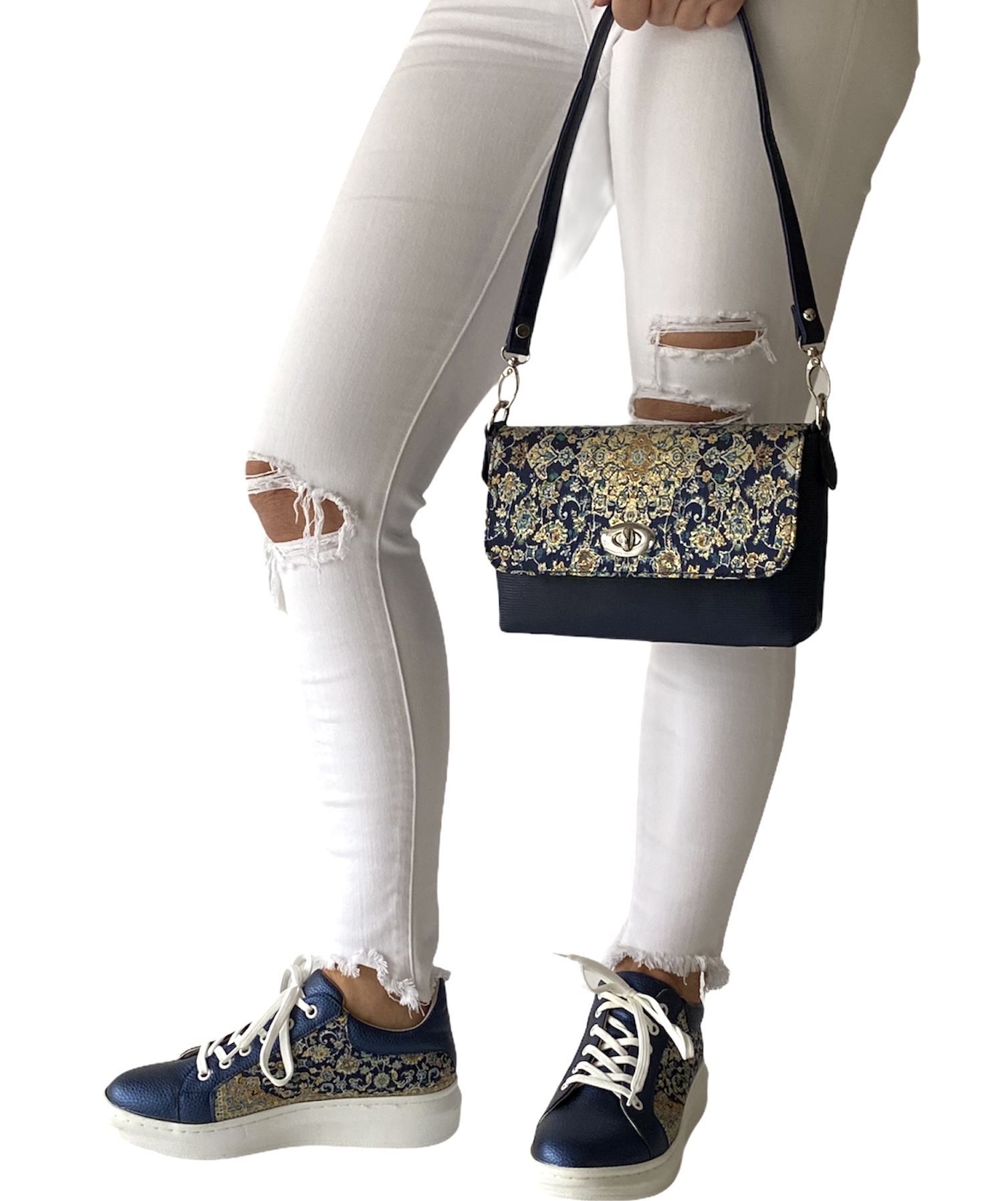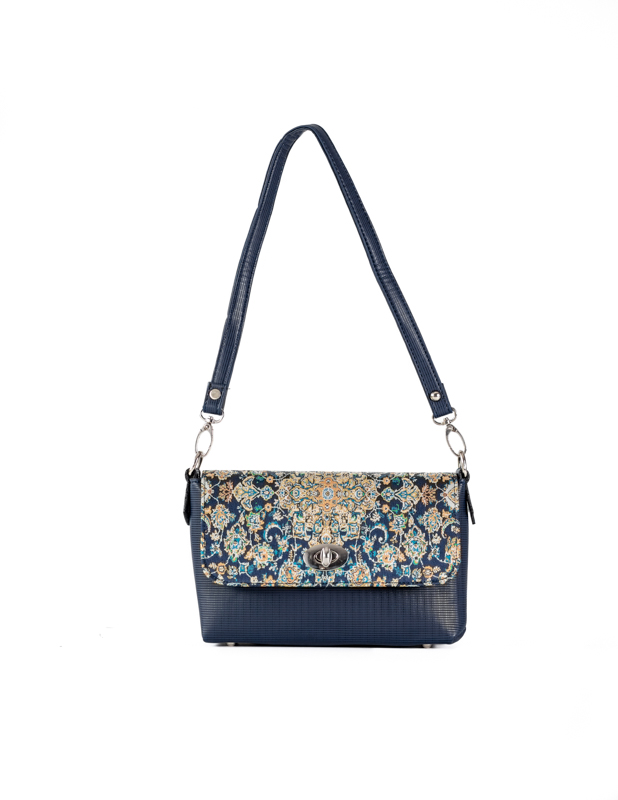 Make a statement with this one of a kind handmade vegan baguette. Made using a kilim design woven silk fabric and vegan leather. Comes with a removable short shoulder strap as well as a long adjustable crossbody strap. Perfect for shopping or a night out.
