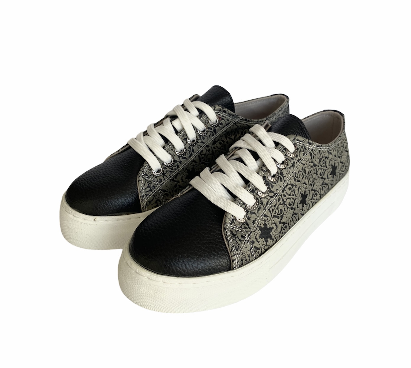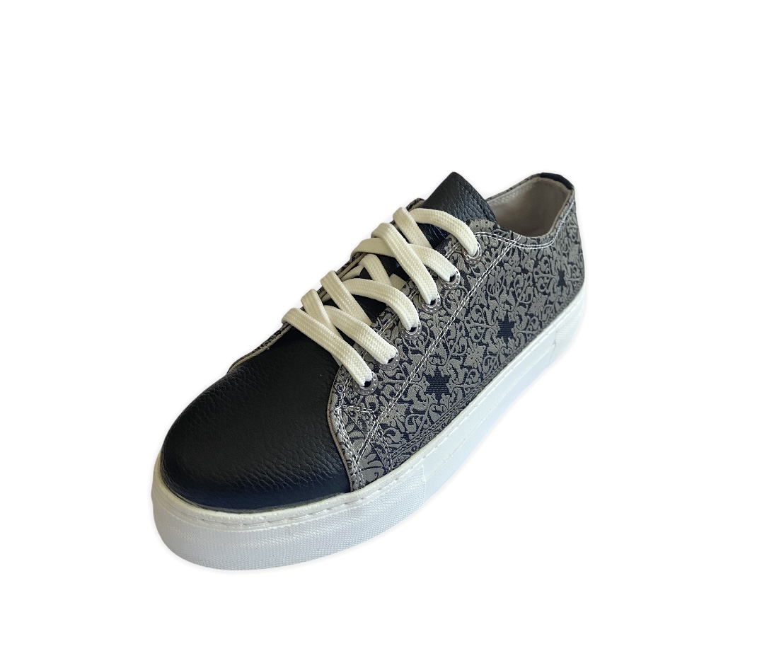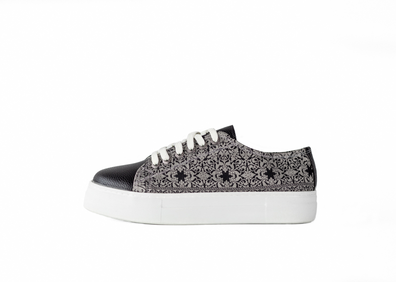 If you love the trend of chunky soles but want something a little sleeker, you’re in luck. An oversized flat rubber heel, woven silk fabric, and soft vegan leather finish this one of a kind look. Coordinate your style with our matching accessories.