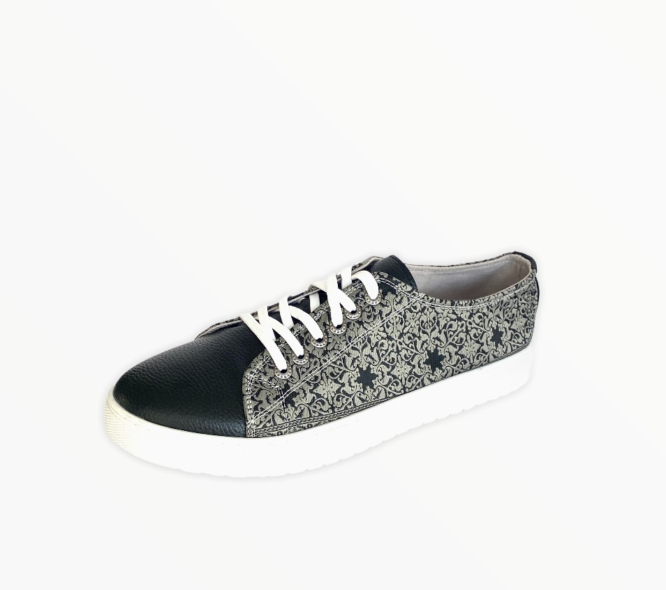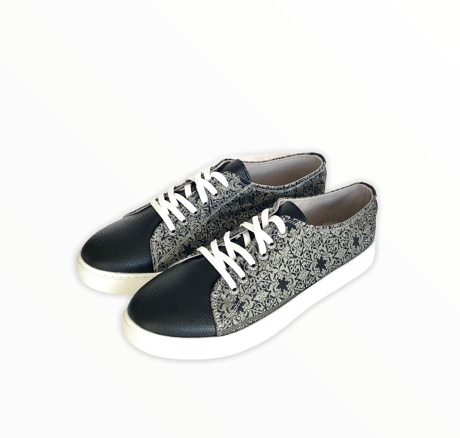 Take your timeless converse up a notch with our fashionable kilim design sneaker.  Made using intricate woven silk fabric and soft vegan leather.  Pairs easily with any outfit for a new look.